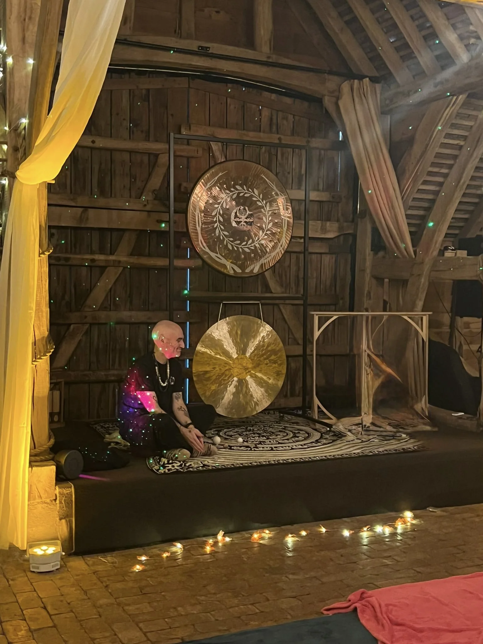 A person sitting on a stage with a wooden background, surrounded by decorative metallic gongs, colorful lights, yellow curtains, and string lights on the floor.