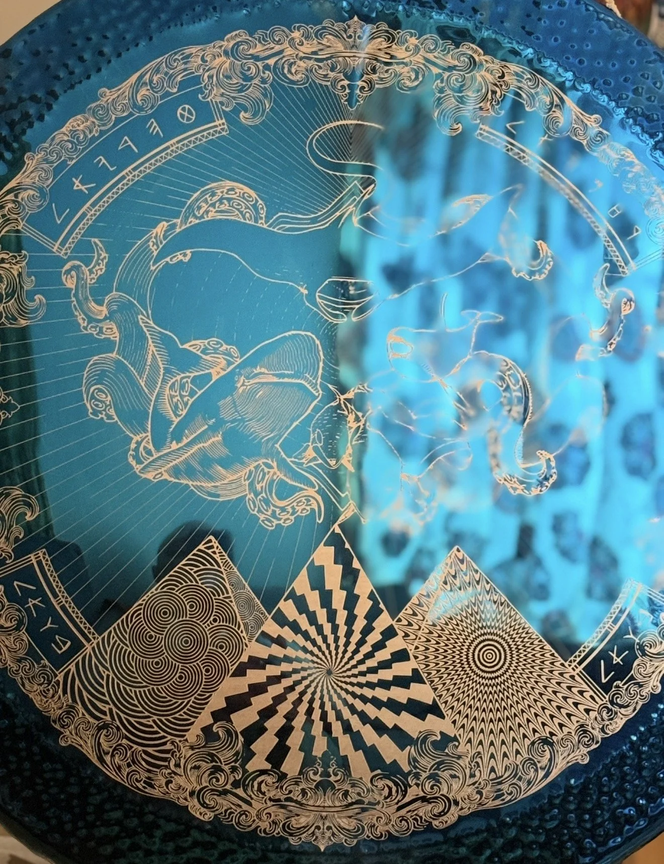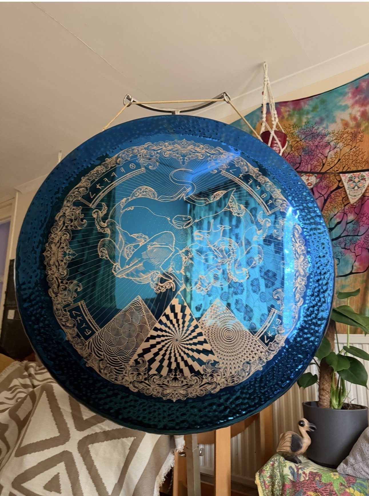 A large blue circular gong hanging from a metal stand with ornate silver designs, geometric patterns, and a dragon illustration on its surface, placed indoors near colorful wall art and a potted plant.