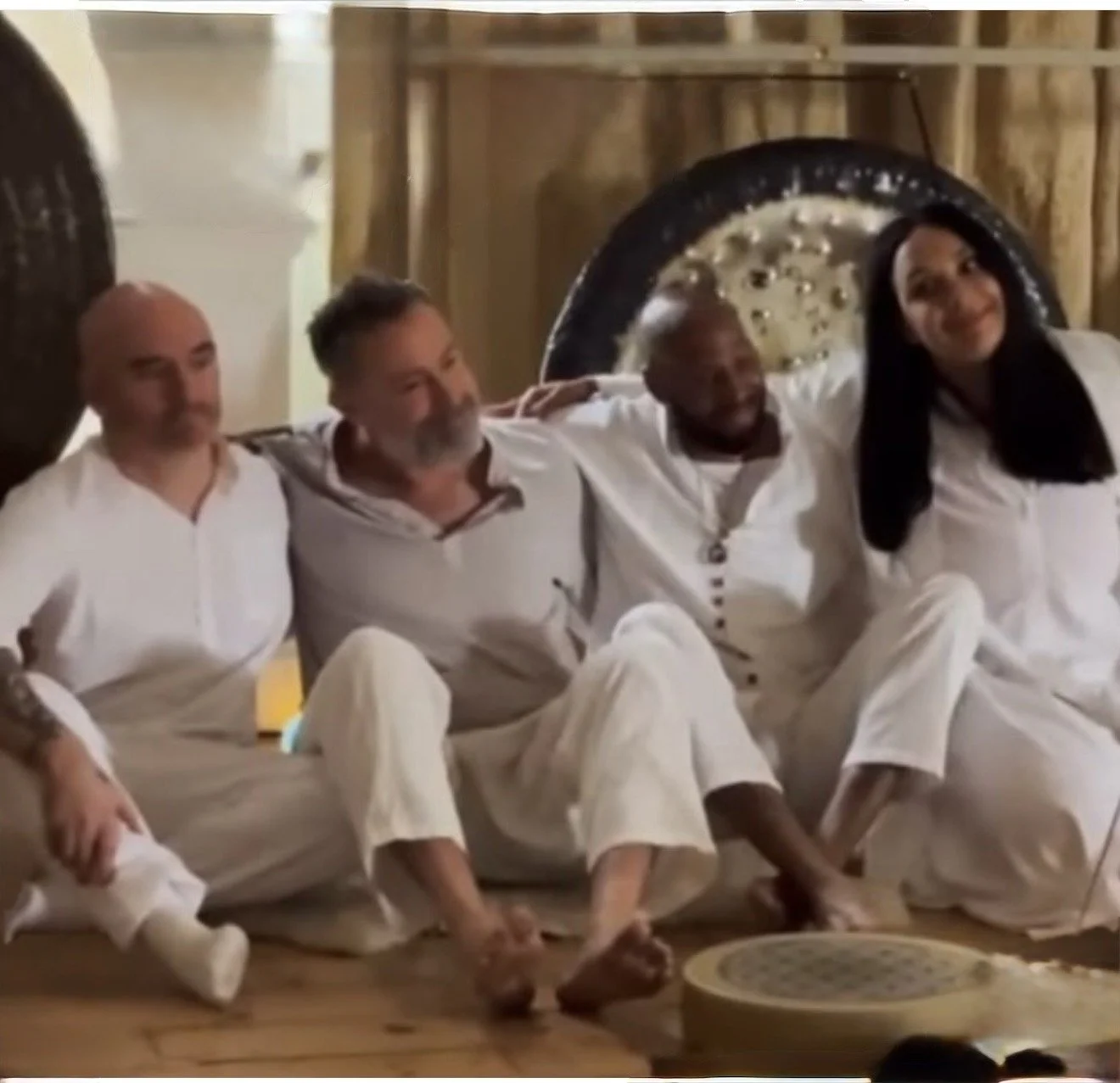 Three people sit cross-legged on a wooden floor surrounded by meditation and spiritual items, with large gongs and a decorative backdrop behind them.