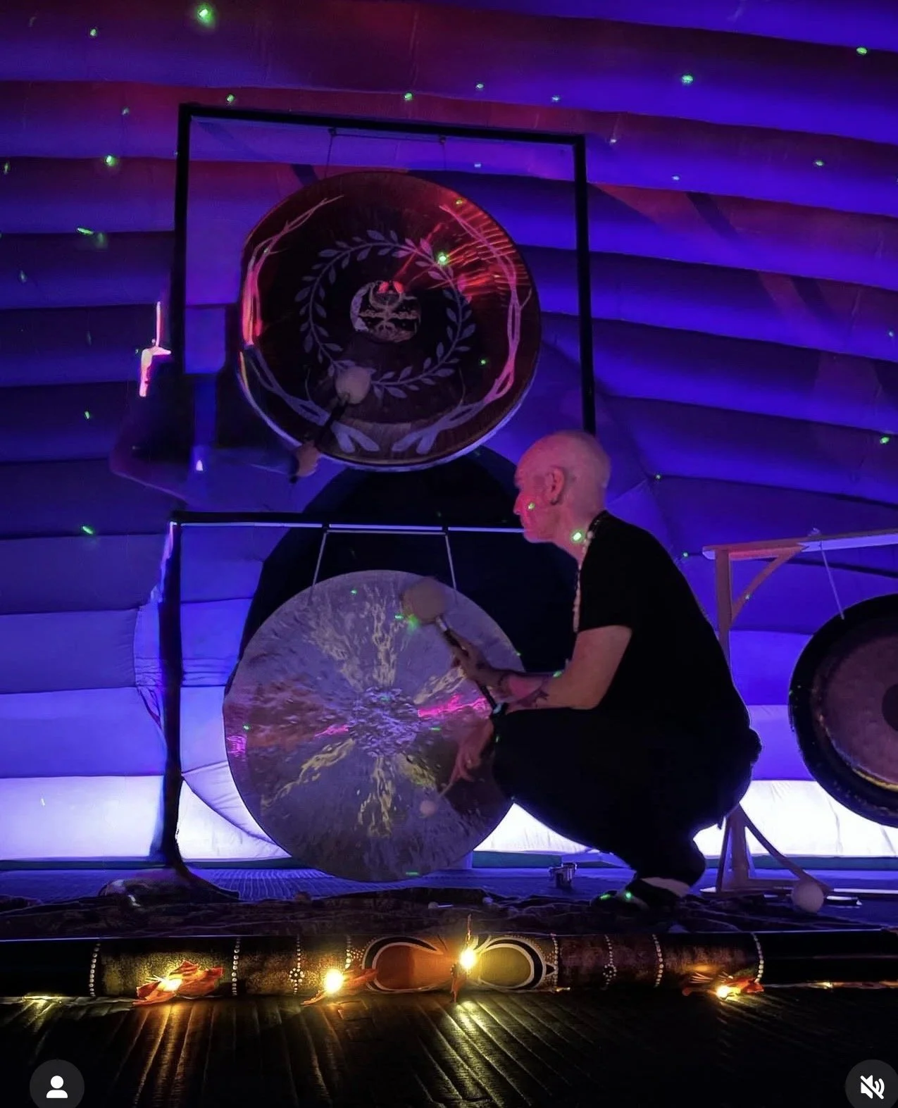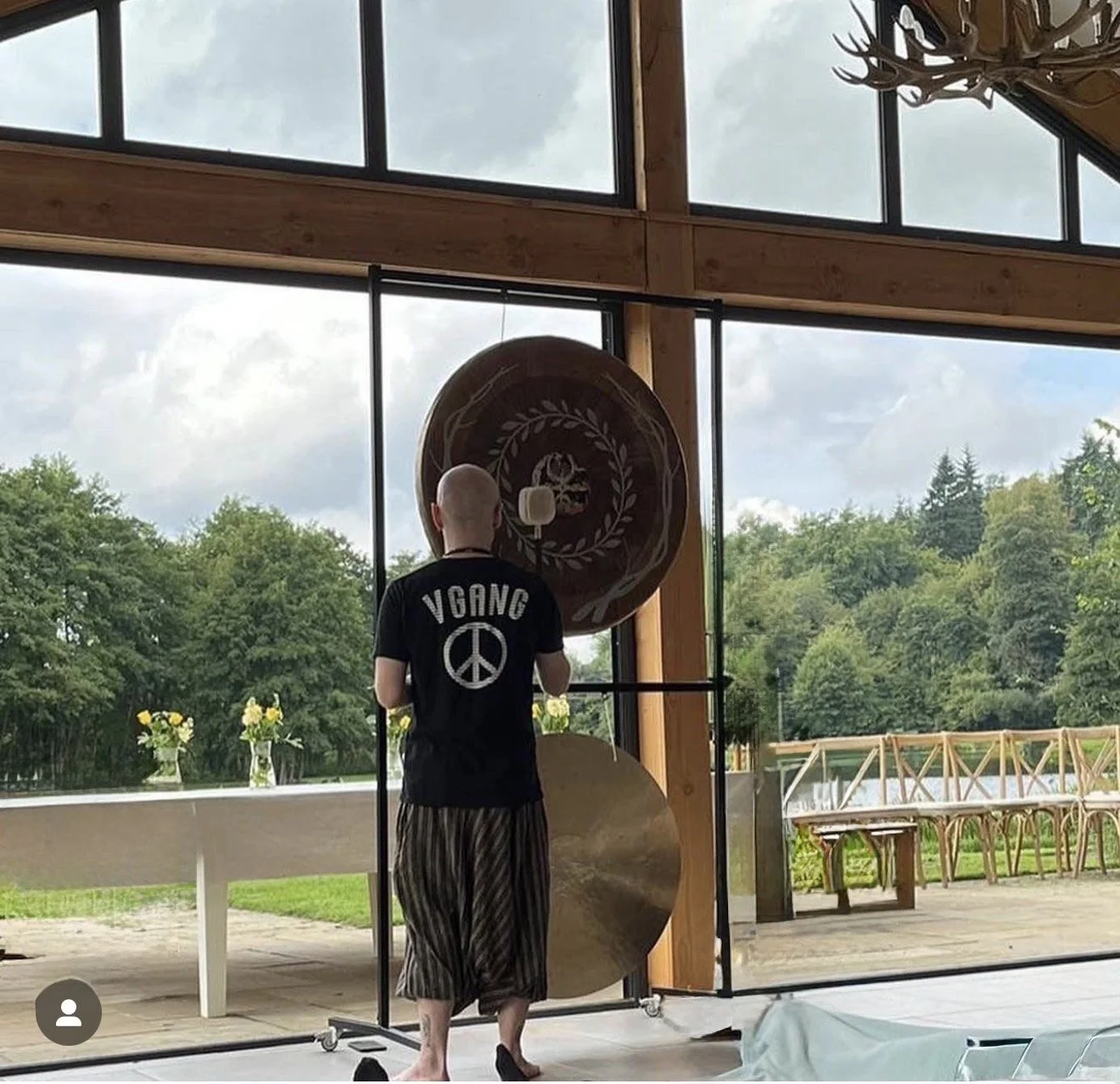 A man with tattoos and a bald head is standing inside a room with a wooden ceiling, playing a large gong with a mallet. There are several people lying on meditation mats in the background.